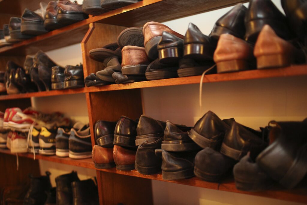 Barnaby stores hundreds of different shoes on a massive bookshelf he inherited from his grandparents. In between high heels, army boots and slippers, he has his “Gary Oldman shoes” that he wore when he did Gary Oldman’s steps on Tinker Tailor Soldier Spy, alongside the ones he wore when he was Diego Maradona on the football pitch in the eponymous documentary. His shoe collection mainly comes from eBay, car boot sales and charity shops, and it never stops growing: “There’s a charity shop down the road from our Essex studio, so every time I go past it to get lunch, I nip in and see if they’ve got any new shoes to update the collection and the range of sounds we can create.”