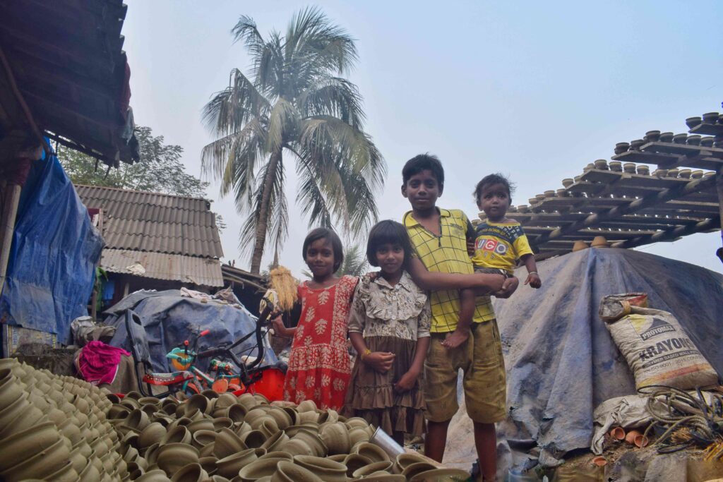 Kulhars are made throughout India by collecting natural, locally sourced clay, often from the ghats (riverbanks) of rivers such as the Hooghly (a tributary of the Ganges) in Kolkata. The clay is then shaped by specialist artisans using a potter’s wheel, before being left out to dry and then fired in a kiln. Whole communities are involved in the making process of bhars. Such is the case with the artisans photographed in Bagnan, Howrah District, on the outskirts of Kolkata. The cups are then transported to street vendors and tea establishments across the region.