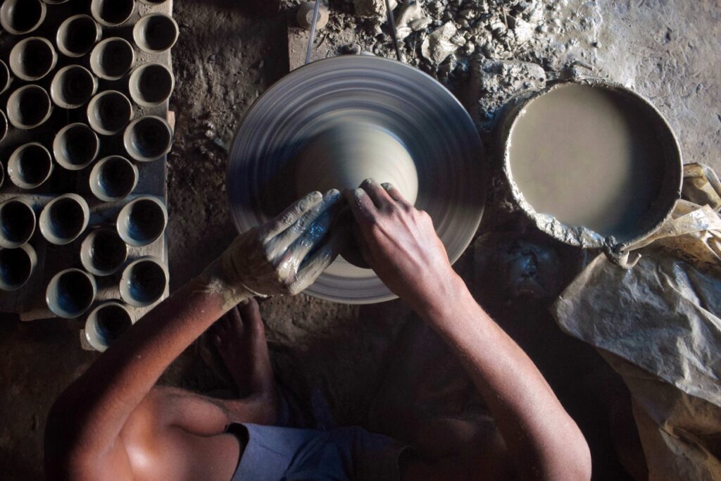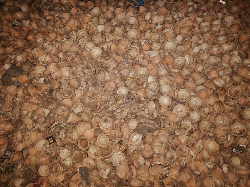Kulhars are unglazed and are therefore almost never re-used. In fact, it is customary to smash a used kulhar in the street, either by throwing it or stamping on it. Bishal explains, “We smash the bhar to make sure that no one can reuse it, for the purpose of hygiene.” Kulhars may be the prototype single-use cups, but they are far less harmful to the environment than plastic or paper cups. As they are made from 100% natural clay, the smashed cups return to the earth, supposedly not upsetting the equilibrium of the local environment.